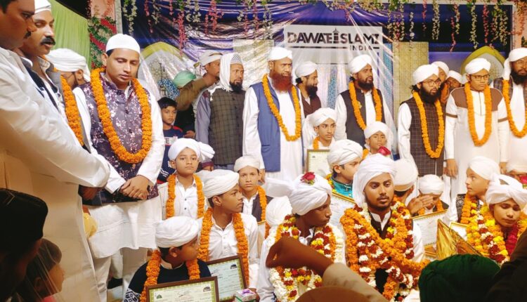 گورکھپور، دعوت اسلامی انڈیا کے زیر انتظام مدرسۃ المدینہ جامعۃ القریش اندھیاری باغ کا سالانہ پروگرام منگل کی رات ہوا، تلاوت قرآن پاک قاری عبدالجواد، نعت پاک عادل عطاری نے پیش کی، وہیں مہمان خصوصی مولانا آصف مصباحی نے پورا قرآن پاک حفظ کرنے والے ابو طلحہ، محمد ارسلان، محمد فرحان، محمد ریحان اور محمد افضل کے سر پر دستار باندھ کر انہیں سند عطا کی، اسی کے ساتھ ساتھ ناظرہ قرآن مکمل کرنے والے مدرسہ کے 27/ طلبا کو بھی سند دی گئی، طلبا کو دعاؤں، پھولوں کے ہار اور تحائف سے نوازا گیا۔
