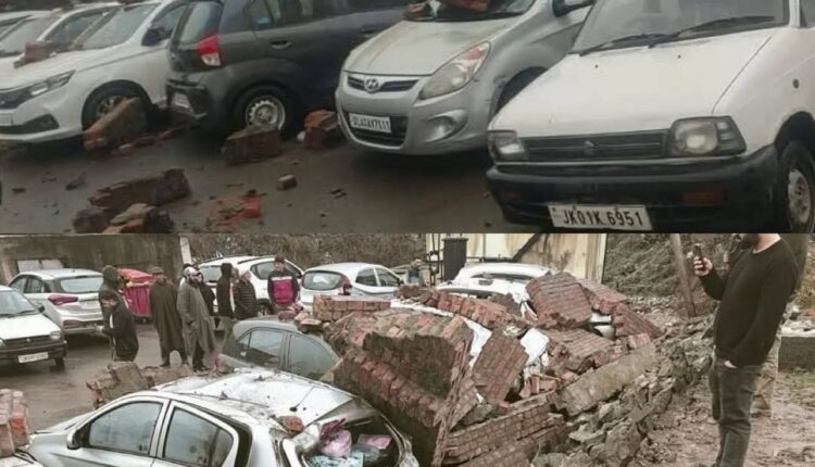 Srinagar, Mar 15, A wall collapsed at the parking area of JLNM Hospital in Srinagar’s Rainawari on Saturday, causing damage to several vehicles.