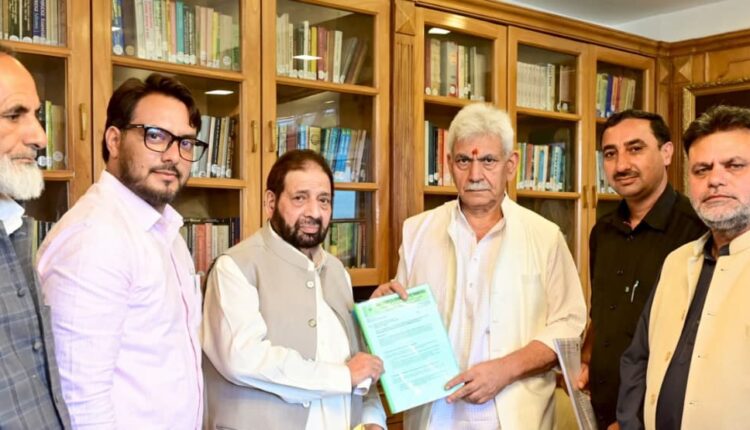 Srinagar, July 12, NSR: A delegation of the People’s Democratic Front (PDF) led by its President, Hakeem Mohammad Yaseen, met Lieutenant Governor Manoj Sinha at Raj Bhavan, Srinagar, today. The delegation included PDF Vice President Showkat Ahmad Raina, General Secretary Dr. Nissar Paul, Chief Spokesperson Mushtaq Shameem, and District President Srinagar Sheikh Ab Rashid.
