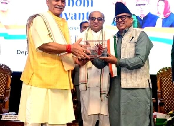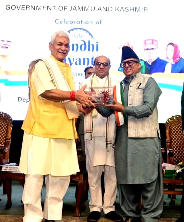 On the occasion of Gandhi Jayanti and Seva Parv celebrations, Malik Noor-ul-Amin, General Secretary of Gandhi Global Family Kashmir, was honored with the National Award on Seva Parv by Lieutenant Governor Manoj Sinha at the SKICC in Srinagar on October 2, 2025.