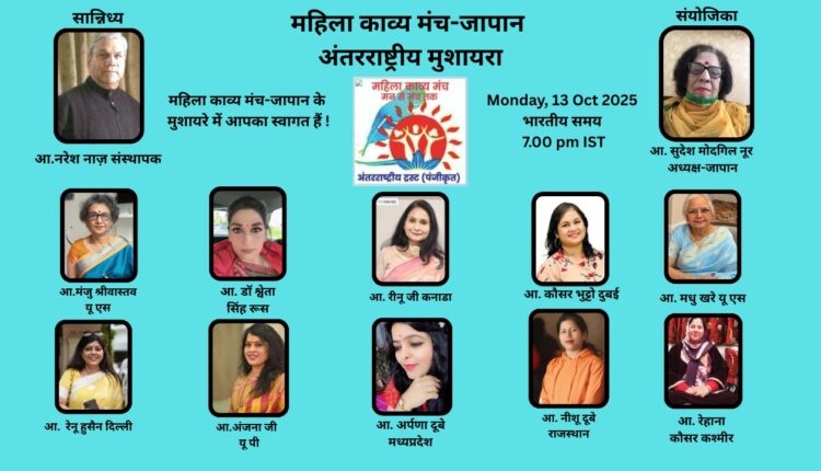 A grand international women’s meeting was held on October 13, 2025, under the esteemed organization Japan Mahila Kavi Manch, led by Dr. Sudesh Noor. The event brought together renowned poets and intellectuals from across the globe, celebrating women’s empowerment and literary excellence. Rehanna Kausar from skims soura,a celebrated poet from Kashmir, made a significant impact on the global stage, participating online and captivating the audience with her poetic rendition. The meeting provided a unique platform for poets to share their work, exchange ideas, and foster cultural understanding. The event showcased the power of women’s voices and their contributions to literature, highlighting the importance of global solidarity and creating spaces for women’s stories to be told. With participation from esteemed poets and intellectuals from diverse backgrounds, the meeting concluded with a renewed commitment to promoting women’s empowerment and celebrating their achievements. The event was a testament to the universality of women’s experiences and the impact of literature on global audiences. Dr. Sudesh Noor’s vision and leadership played a pivotal role in making this event a resounding success.